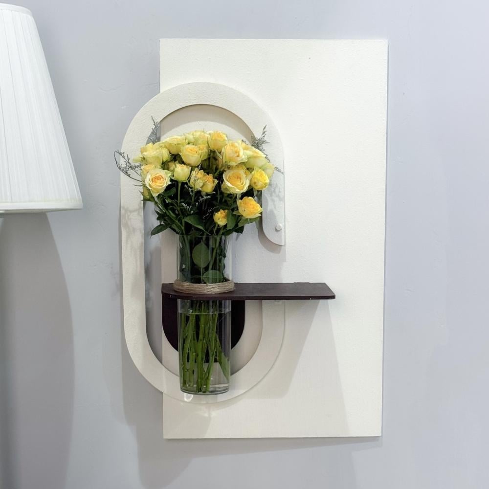 تصميمها المبتكر بلوح خشبي أبيض وفتحة دائرية يحتضن فازة زجاجية شفافة، مما يخلق تباينًا بصريًا جذابًا.