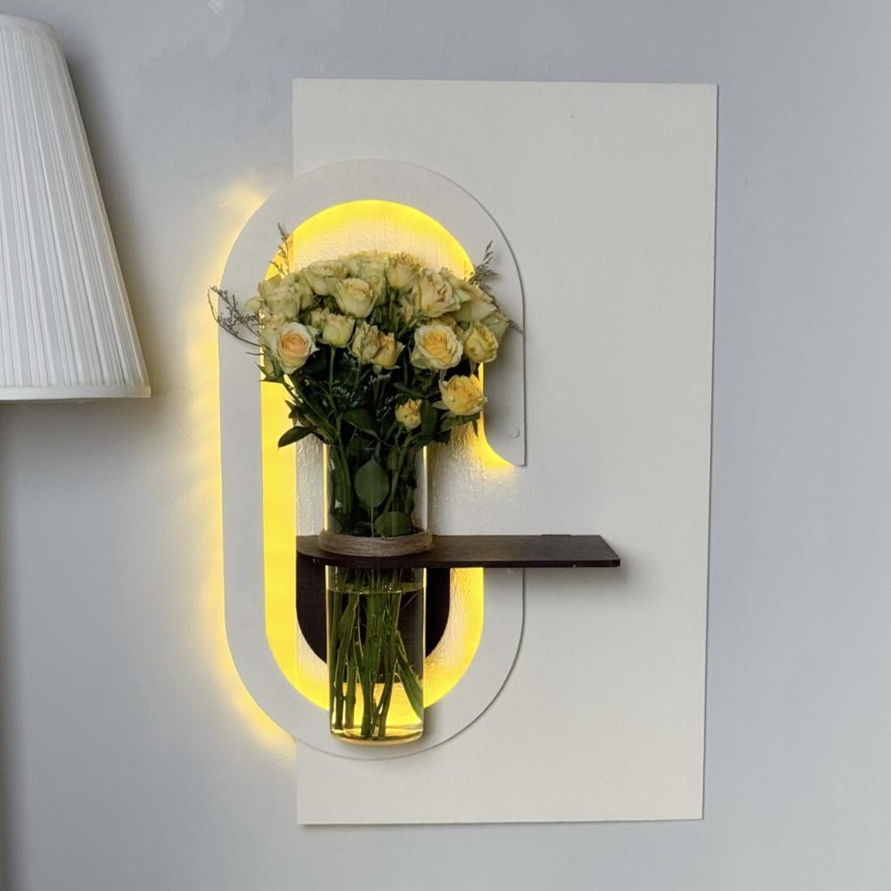 الميزة الأكثر سحرًا هي الإضاءة الخلفية LED التي تحيط بالفازة. عند تشغيلها، تبعث ضوءًا ذهبيًا دافئًا يسلط الضوء على الزهور ويضيف لمسة من الرومانسية والهدوء على أي غرفة.
