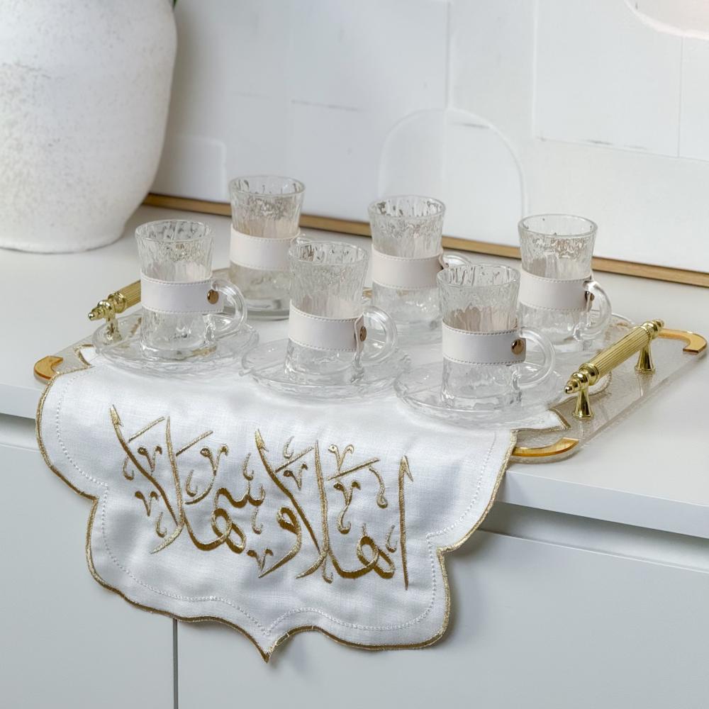 قطعة قماش أنيقة مصممة خصيصًا لتزيين صواني التقديم، بلون أبيض ناصع وتطريز فاخر بخيوط ذهبية لعبارة "أهلًا وسهلًا" بخط عربي جميل.