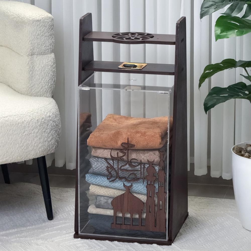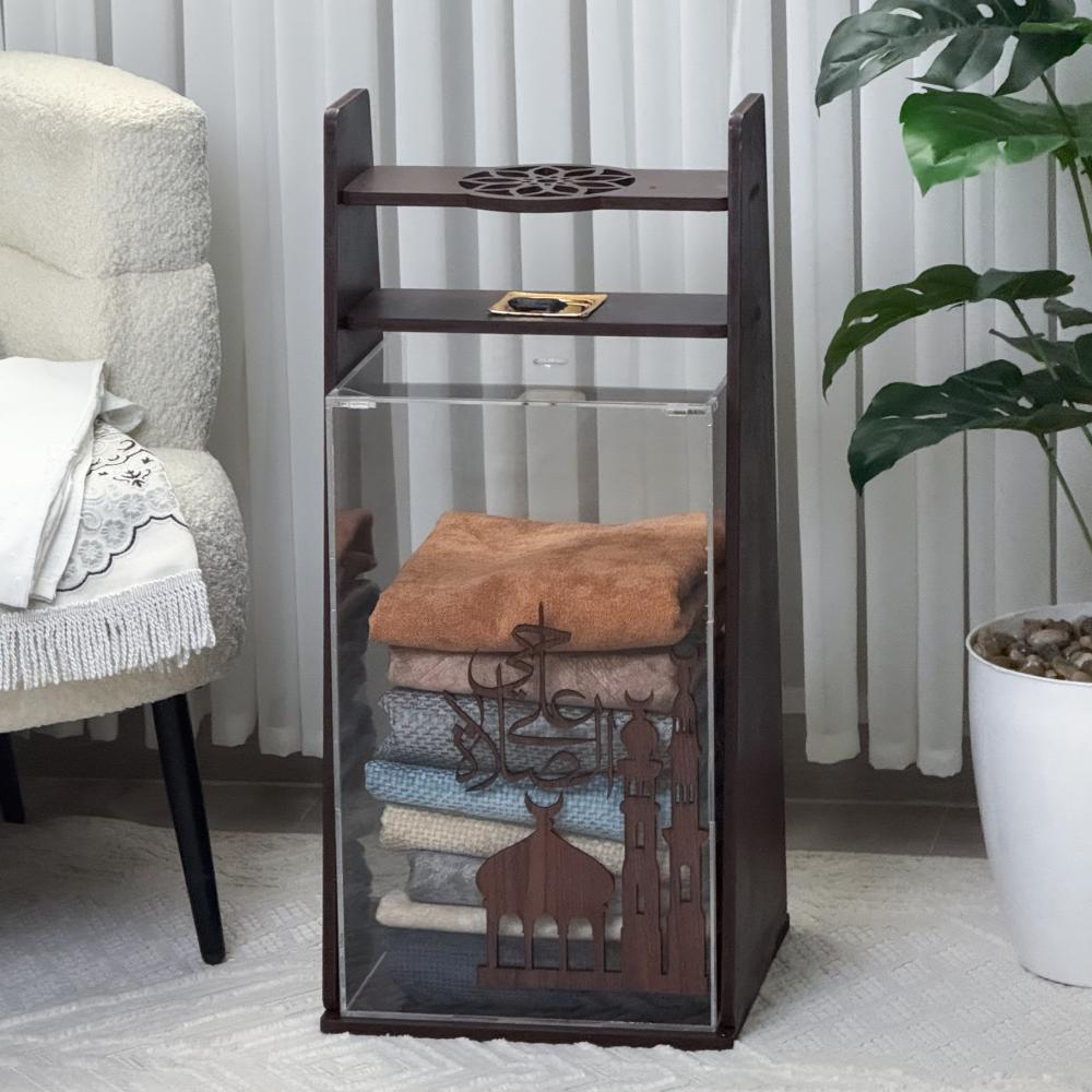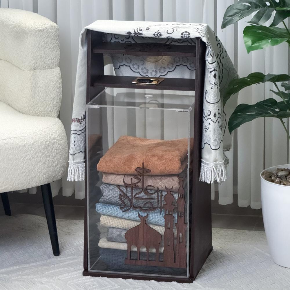 • حامل للسجادة: يتضمن مساحة علوية مخصصة لتعليق أو طي سجادة الصلاة بشكل أنيق، كما يظهر في الصورة الثانية.